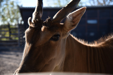 Detailed view of an antelopes face behind a wooden fence at Belgrade Zoo in autumn. Soft focus and natural light