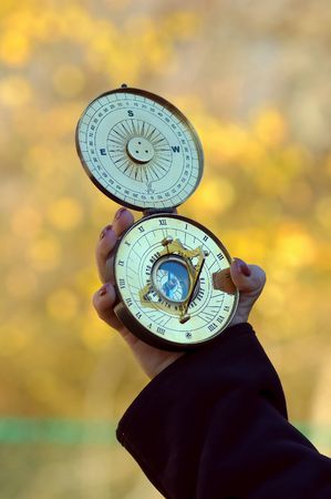Female hand of traveler, hiker with compass on background autumn forest landscape with mountains on the horizon in orange colors in fall.