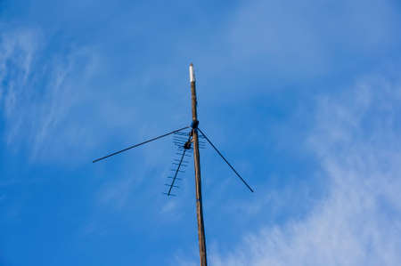 Telecommunication tower with clear blue sky background. Antenna on blue sky background. Radio and satellite pole. Communication technology.