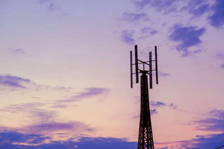 Low angle of silhouette of antenna tower on background of pink and violet sundown sky