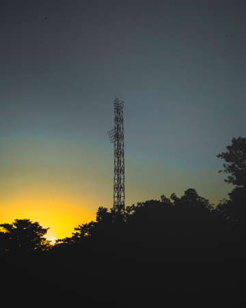 A tall telecommunications tower with multiple antennas and dishes silhouetted against a vibrant sunset sky, showcasing modern communication infrastructure and wireless connectivity.