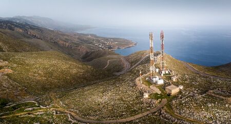 Aerial view of communication towers on a mountain, transmitting signals over a wide area.