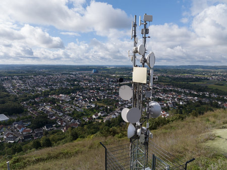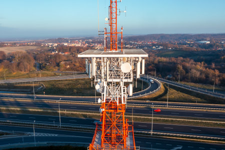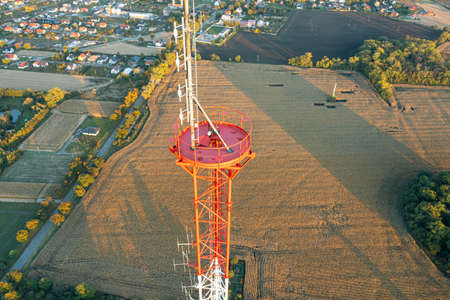 Cell site of telephone tower with 5G base station transceiver. Aerial view of telecommunication antenna mast