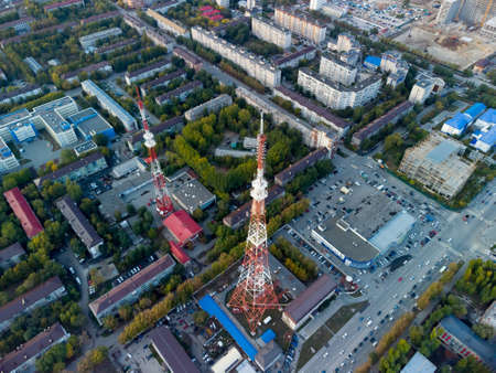 Aerial view of TV antenna in the middle of a city , red roofs on a housing community, vacant lots, urban and rural view.
