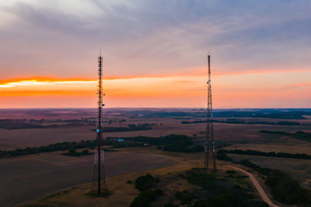 Captured during sunset, this stunning aerial view shows two communication towers amidst an expansive rural landscape, highlighting tranquility.