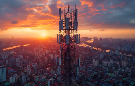 Telecommunication tower with 5G antenna in city background, depicting advanced global connection and internet network concept