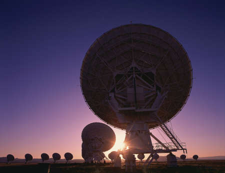Silhouetted field of VLA Very Large Array radio telescope dishes