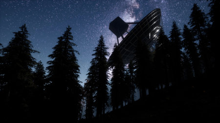 Beneath a cascade of stars, towering trees frame a colossal satellite dish, creating an enchanting silhouette.