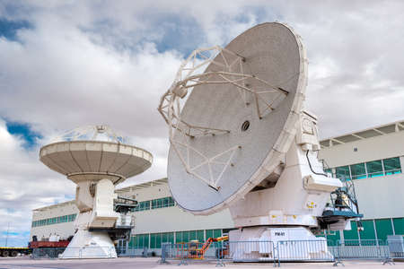 San Pedro de Atacama, Atacama Desert, ALMA Base Camp, Chile – ALMA Base Camp infrastructure and machinery with large radio telescopes.