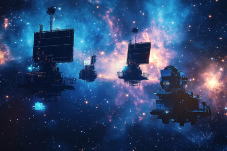 Two spacecraft operate in deep space, connected by a data transmission line, amidst a starry backdrop.