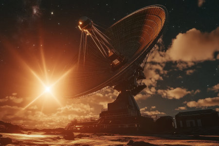 A large radio telescope stands on a remote location, capturing cosmic signals as the sun sets.
