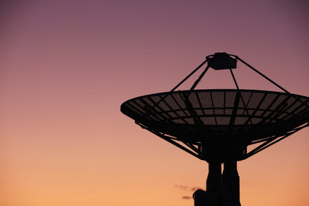 Satellite dish sky sun stars communication technology network image background for design sunset
