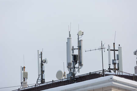 Cellular antenna on the roof of the building against the blue sky