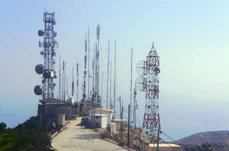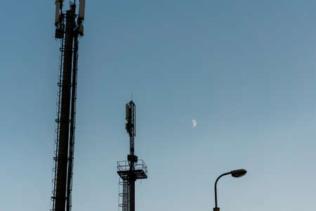 Telecommunication towers of mobile and cellular communication antennas on the background of the sky.