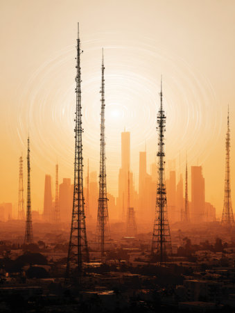 Tall communication towers stand prominently in a modern skyline, emitting signals as the sun sets, casting an orange glow over the urban landscape.