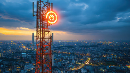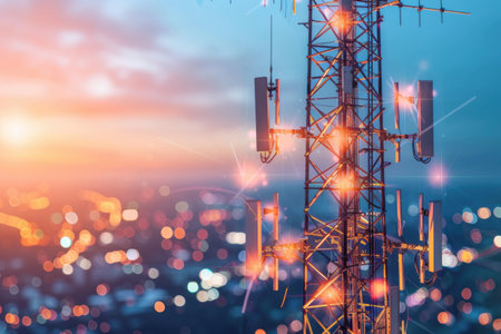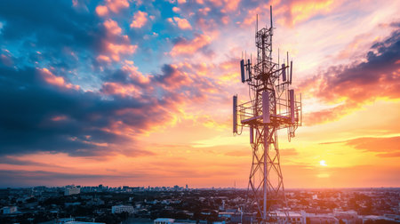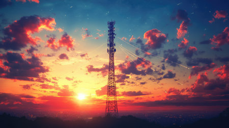 An Innovative communication tower at sunset, showcasing high speed internet technology
