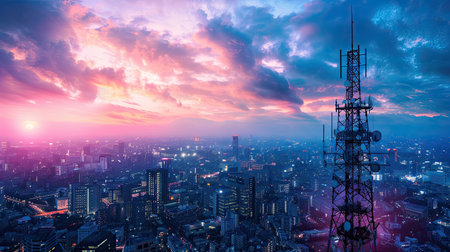 Urban skyline with telecommunication tower and 5G antenna, showcasing worldwide connectivity and internet network