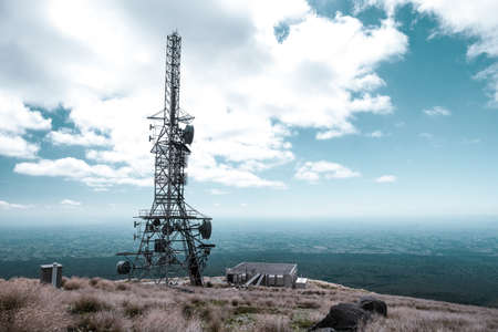 A cell phone signal pole on a high mountain. Beautiful landscape scene with blue sky.