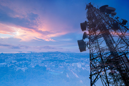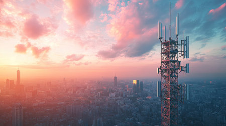 Telecommunication tower with 5G antenna in city background, depicting advanced global connection and internet network concept