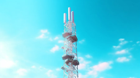 3D rendering of a telecommunication tower against a blue sky with clouds