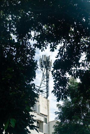 A cell tower rises above a bustling urban landscape, framed by lush green foliage, symbolizing the blend of technology and nature in modern cities.