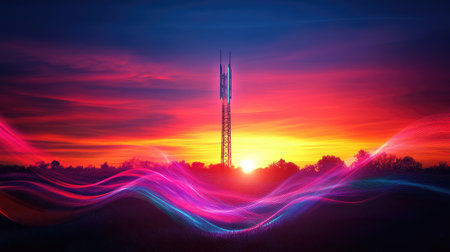 A stunning sunset backdrop highlights a communication tower, surrounded by colorful waves. The vibrant colors create an abstract, serene atmosphere perfect for technology themes.