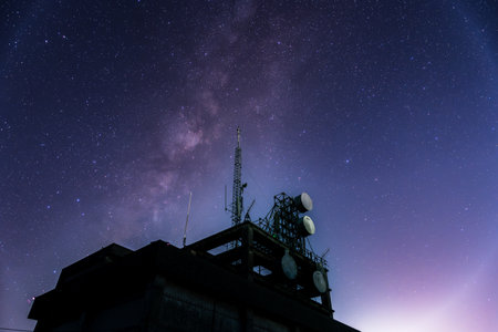 The Milky Way galaxy illuminates the night sky with vivid and realistic outlines of mountains. Taken at Caoshan Radar Station, New Taipei City, Taiwan.