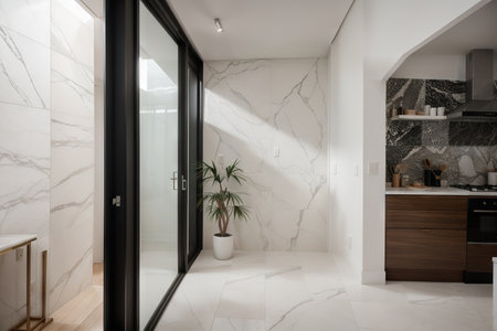 An interior shot showcases a well-lit hallway featuring wooden shelves adorned with framed pictures and plants. The scene is dominated by white walls, doors, and a tiled floor, contrasted by natural wood elements. The composition suggests a clean and inviting aesthetic suitable for various editorial and commercial applications.