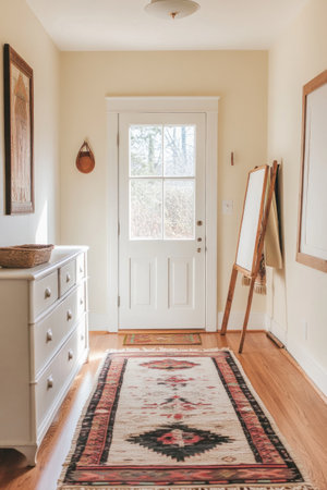 a photo of the interior design of an entryway with white oak flooring, low profile matte finish and light wood flooring. There is one vintage white dresser on each side of door frame. The wall color behind should be pale yellow with some soft shadows. A colorful boho rug lies in front of it. On the right there's hanging from wooden hanger that has black, red stripes and small green accents. In background there’s a window to the outside. The room also features a tall floor lamp beside blank art canvas. --ar 2:3 --v 6.1 Job ID: 14bf5a34-09ff-4f9b-8e95-756f47d6833b