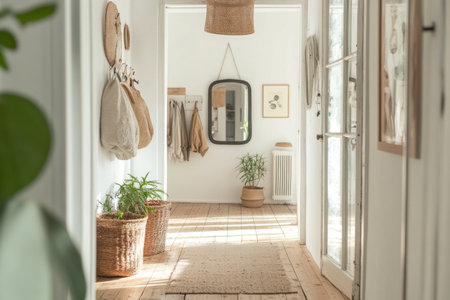 A photograph of an open door leading to the hallway, showcasing Scandinavian interior design with white walls and wooden floors. The hall features hanging mirrors, hangers on wall-mounted racks, potted plants in baskets along one side, and framed artwork on the walls. A large mirror is placed near the entrance, adding depth to the space. Soft lighting illuminates the room through glass windows, creating a warm atmosphere. This scene captures the essence of modern Nordic home decor. --ar 3:2 --v 6.1 Job ID: b7233b13-94c2-47e8-9be2-4db77b0bd4d7