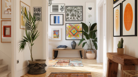 Modern Bohemian Hallway with Eclectic Framed Artwork and Indoor Plants