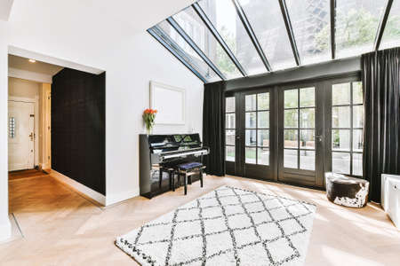 Piano and carpet placed in light hall of modern cottage with glass door and ceiling window
