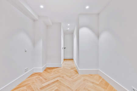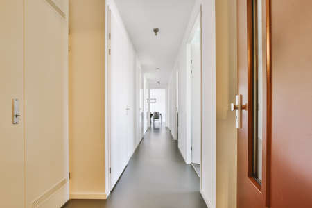 Interior of modern flat in minimal style with narrow empty corridor illuminated by lamps