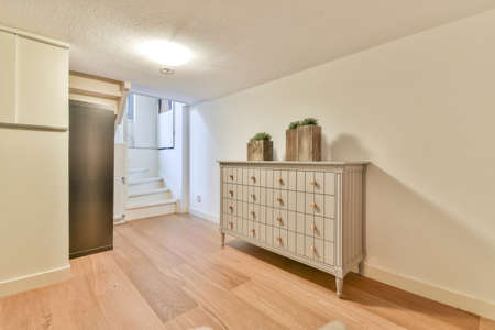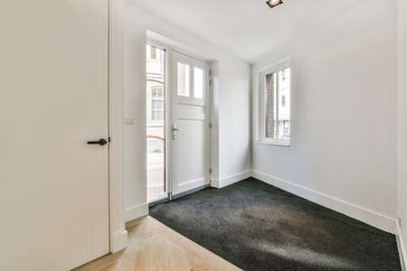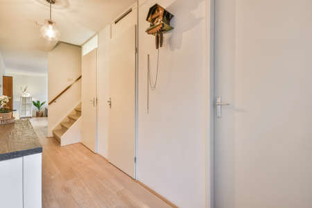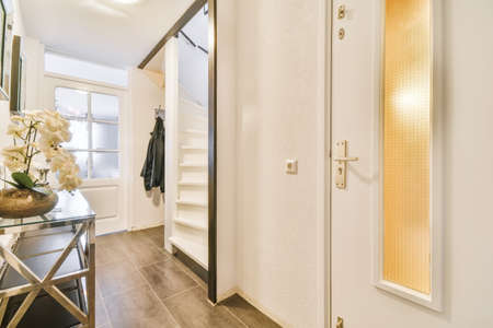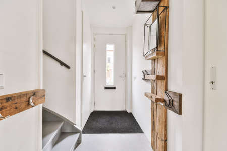 Light hallway with entrance door in apartment with minimalist wooden staircase leading upstairs in daylight