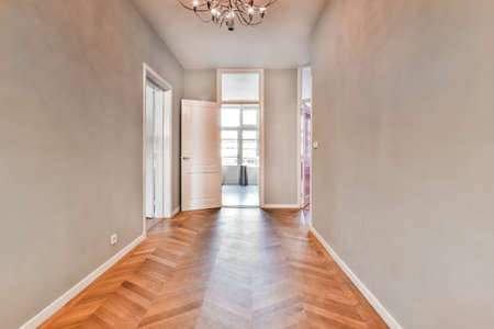 Narrow corridor interior design with parquet floor and white walls decorated with wallpaper in stylish apartment