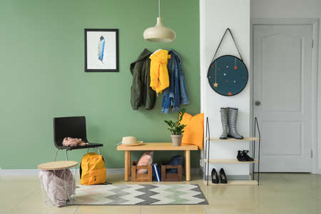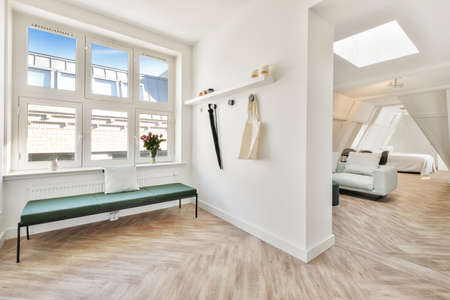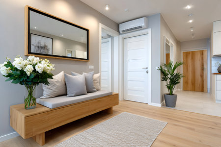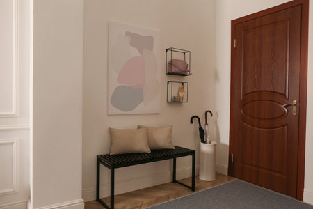 Modern hallway interior with stylish bench and decor