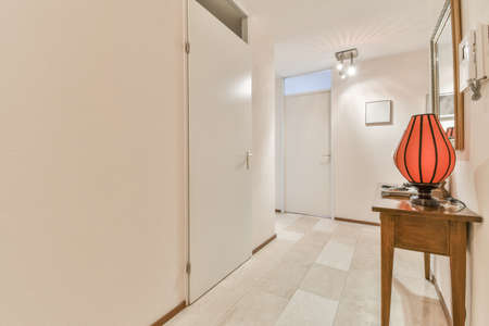 Corridor with a wooden chest of drawers and a red lamp