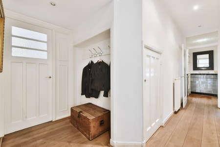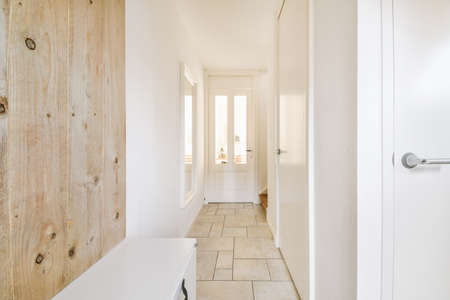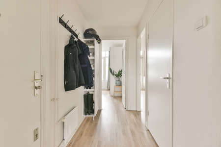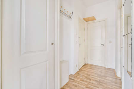 Attractive bright corridor with doors and an iron hanger on the wall