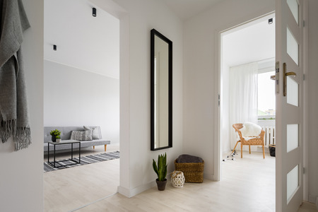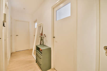 A spacious, bright corridor of a cozy house in a white design
