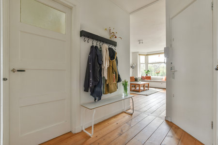 Modern entryway with simple coat hanger, stylish living area and dining table in view, houseplants bringing warmth and life to contemporary space