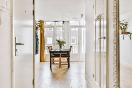 Wooden table with vase and chairs placed near opened balcony door in light dining room at home