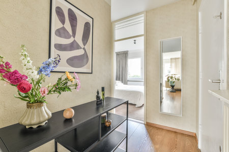 Trendy corridor with big mirror in wooden frame and console table