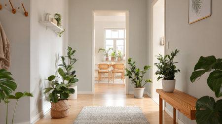 Bright modern hallway with sleek coat hanger, cozy living room and dining table visible in background, decorated with lush green houseplants, minimalistic design