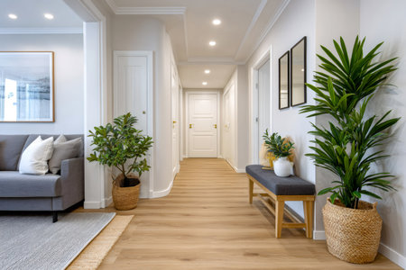 Clean interior hallway with wooden floor, white walls, decorative plants, and a comfortable bench