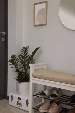 Stylish hallway room interior with bench, shoes and round mirror