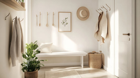 Sunlight streams into a cozy entryway featuring a wooden bench decorative plant and stylish storage boxes. The room embodies a clean modern aesthetic with neutral colors.
