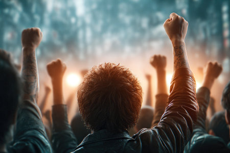 A diverse assembly of demonstrators raises their fists against a backdrop illuminated in intense red lighting. This image symbolizes solidarity and resistance within social causes.