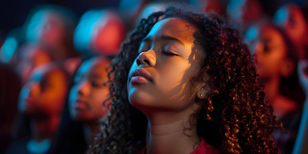 Teenage girl entered in worship while singing during church service. Concept Religious Worship, Church Service, Teenager, Singing, Devotion