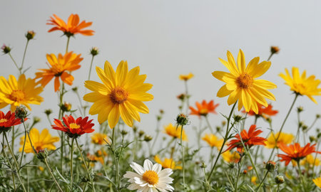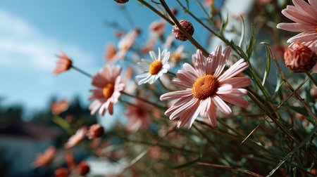 Colorful daisy flowers against a blue sky background