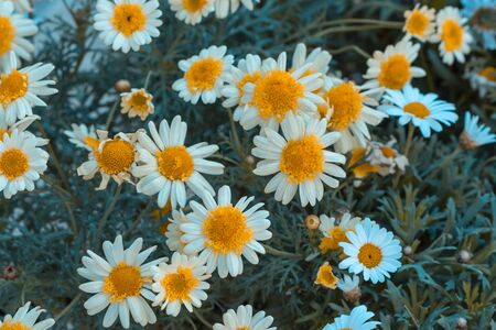 Beautiful fragrant white chamomile flowers with delicate petals bloom at summer twilight. Nature.